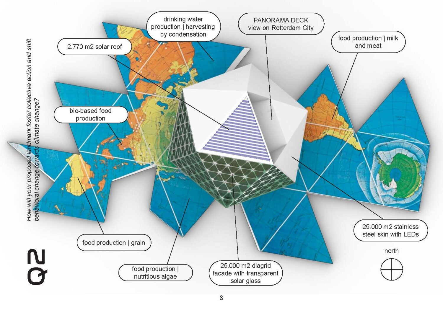 The complete structure is based on one single [parametric] detail including the structure and the skin. Additional elements are the travellators, escalators and elevators, and the [floating] visitor platforms in each node at the inside. Finite element calculations define the itchiness of the individual members of the structural diagrid mesh, stronger in the lower regions, slimmer in the higher regions.