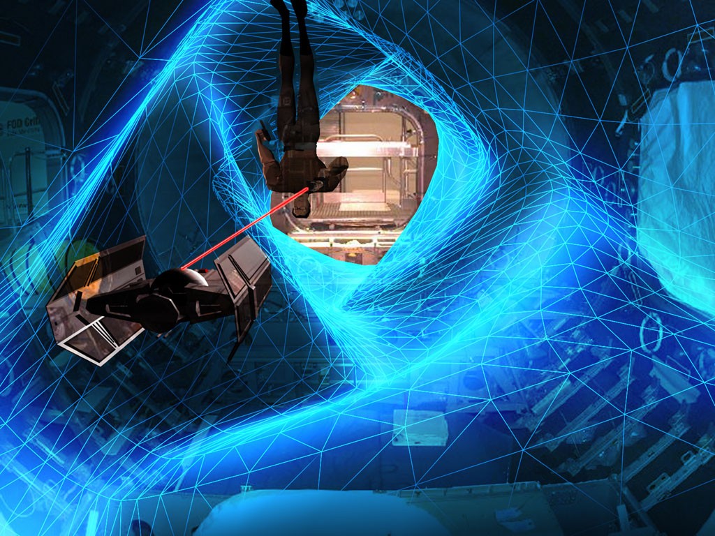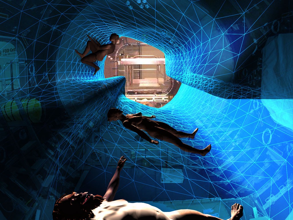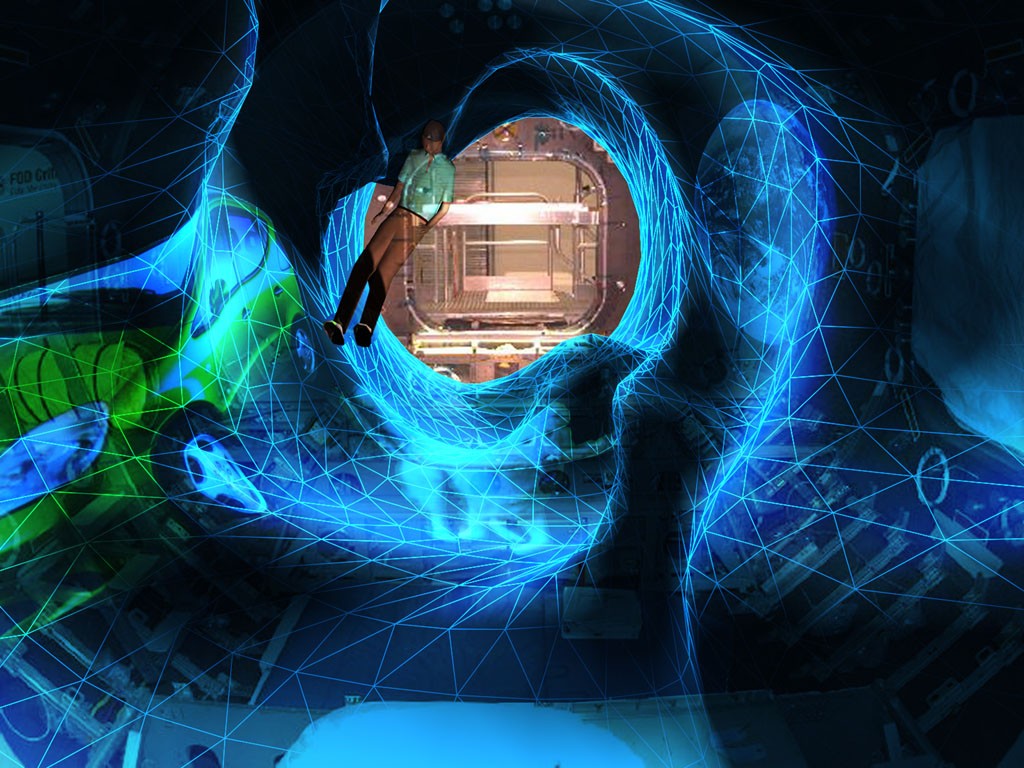 These images merged into the interior skin could also represent a free time environment. In the meantime the skin moulds into the counter shape of the desired activity. Real time images of the family at home, comforting images of familiar nature, or projections from webcams displaying panoramic views as seen from the Space Station. Through these virtual windows the space travellers would be able to experience the feeling of floating in deep space.